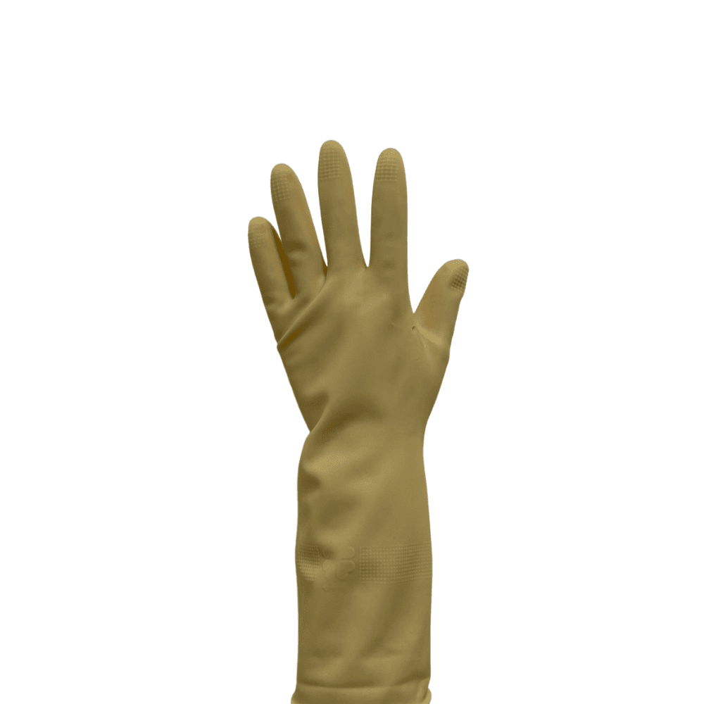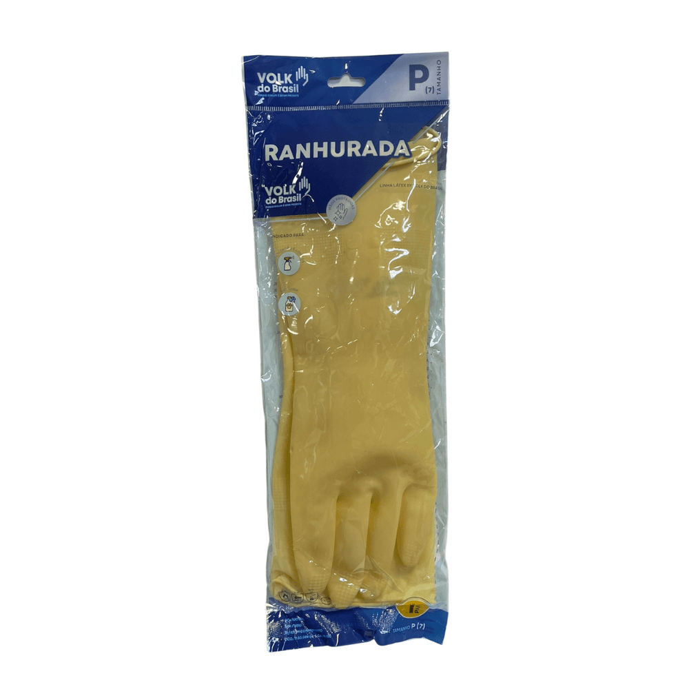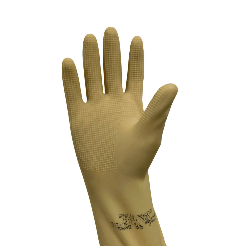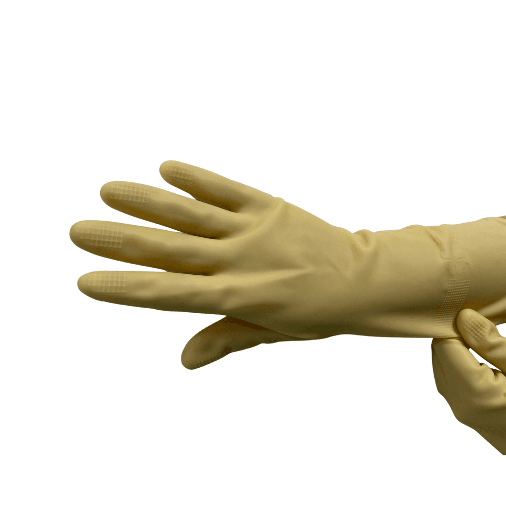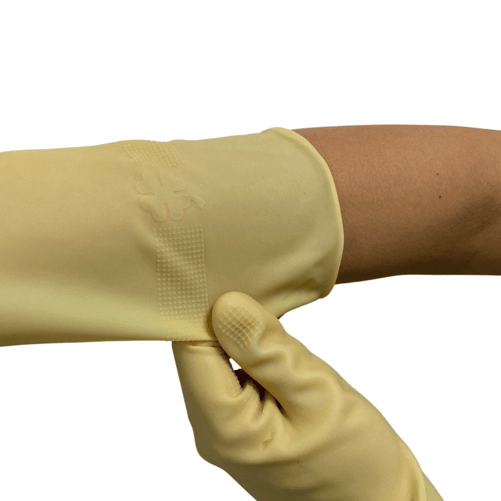 Luva de segurança confeccionada em látex natural, relevo antiderrapante na palma e ponta dos dedos, detalhes de ranhura no punho.