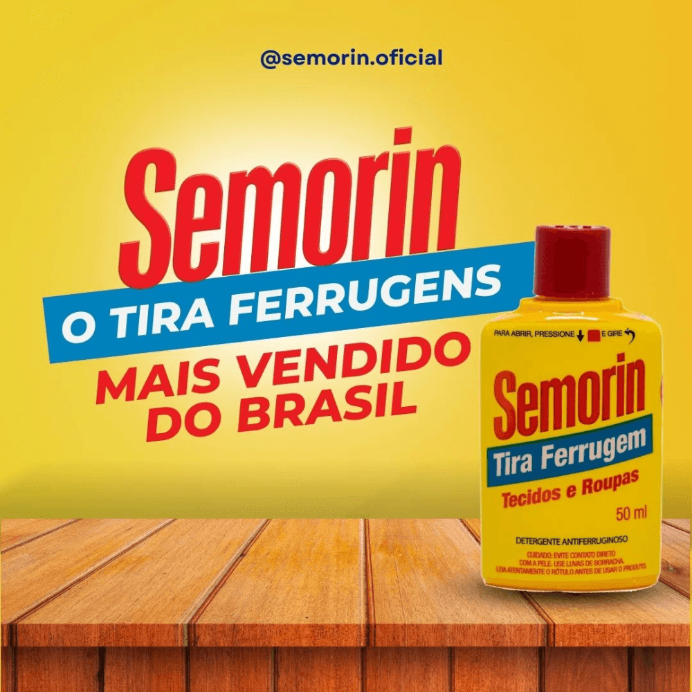 Tira ferrugem Semorin é pioneiro: foi o primeiro tira ferrugem lançado no Brasil – mais de 50 anos de mercado, Semorin tira ferrugem rapidamente se tornou sinônimo da categoria pela sua eficiência e desempenho na remoção de manchas de ferrugem em tecidos. É o líder de vendas e referência de qualidade em todo território nacional e até no exterior. Conta com exclusiva tampa de segurança que evita acidentes no manuseio, mas mantém a simplicidade para utilizar: basta apertar a tampa no sentido inferior (sentido do frasco – para baixo) e depois girar em sentido anti-horário.